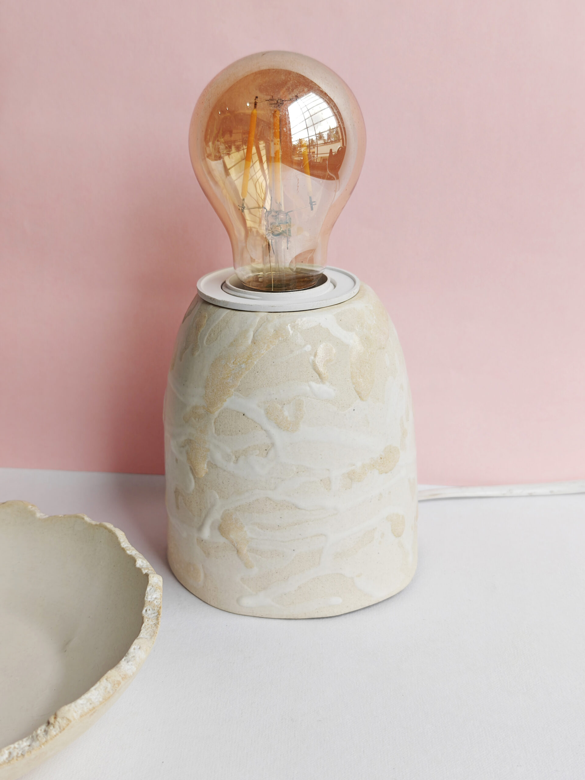 An earthy stoneware lamp in soft beige tones with flowing textures, simple and elegant.