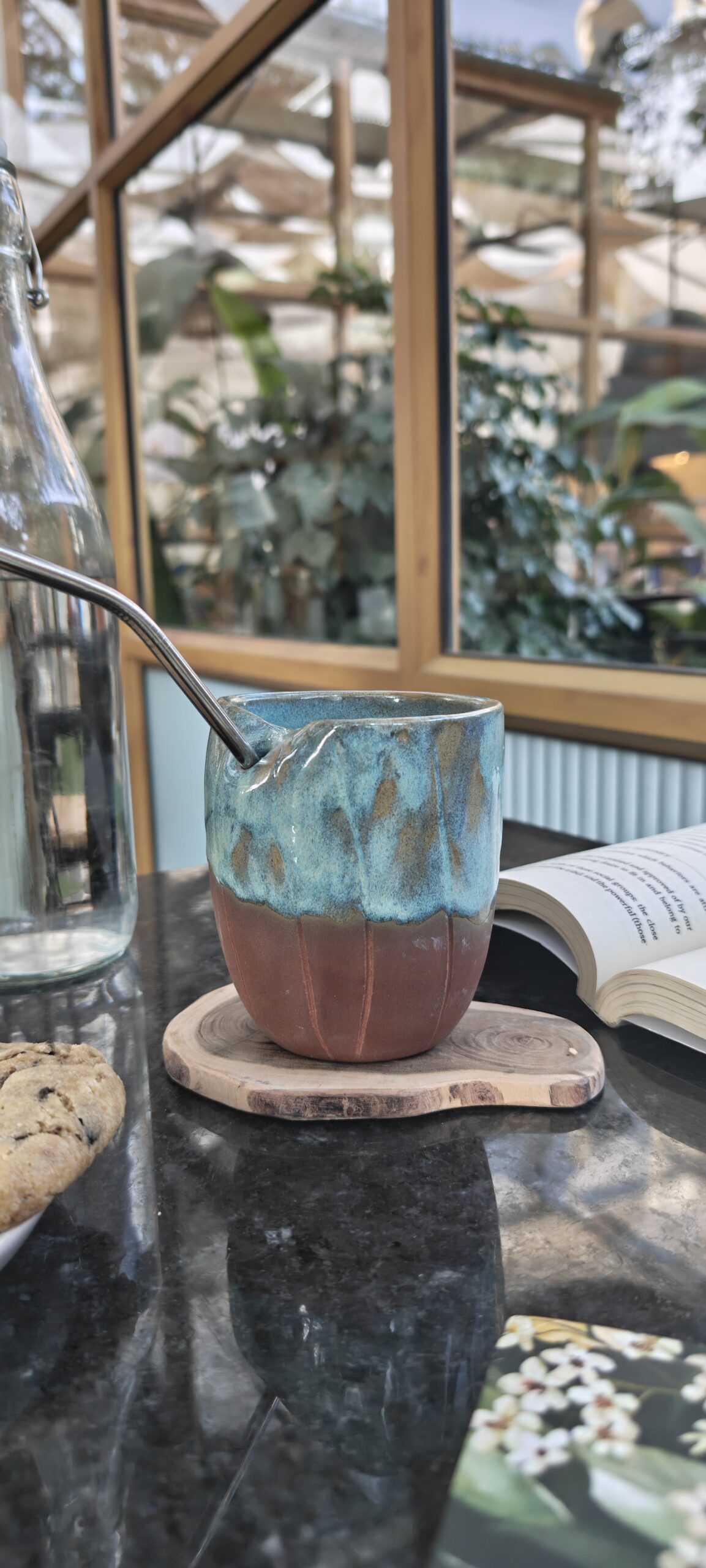 A hand-glazed ceramic sipper with flowing blue glaze over a warm clay base, made for slow, mindful sips.Â