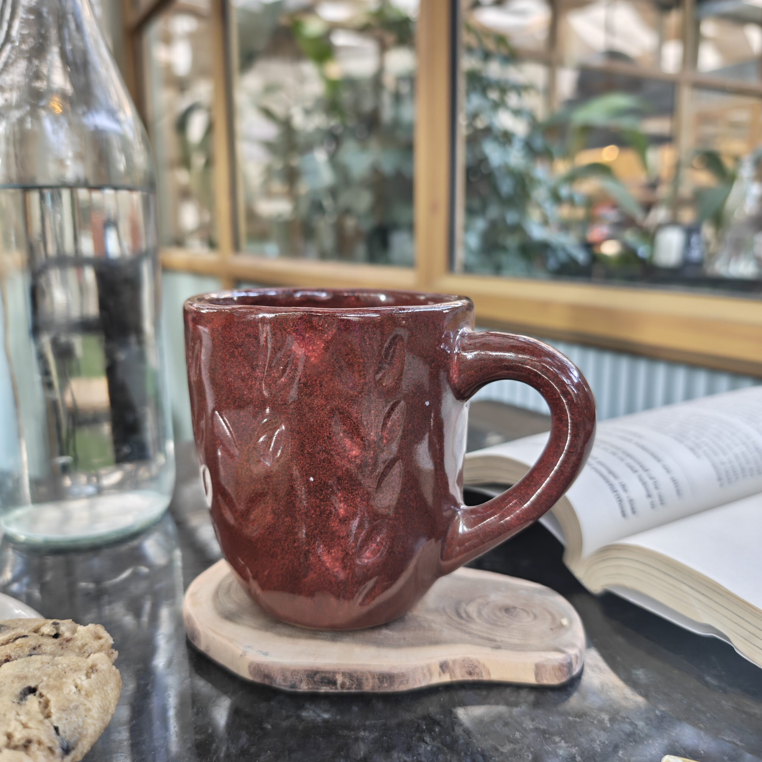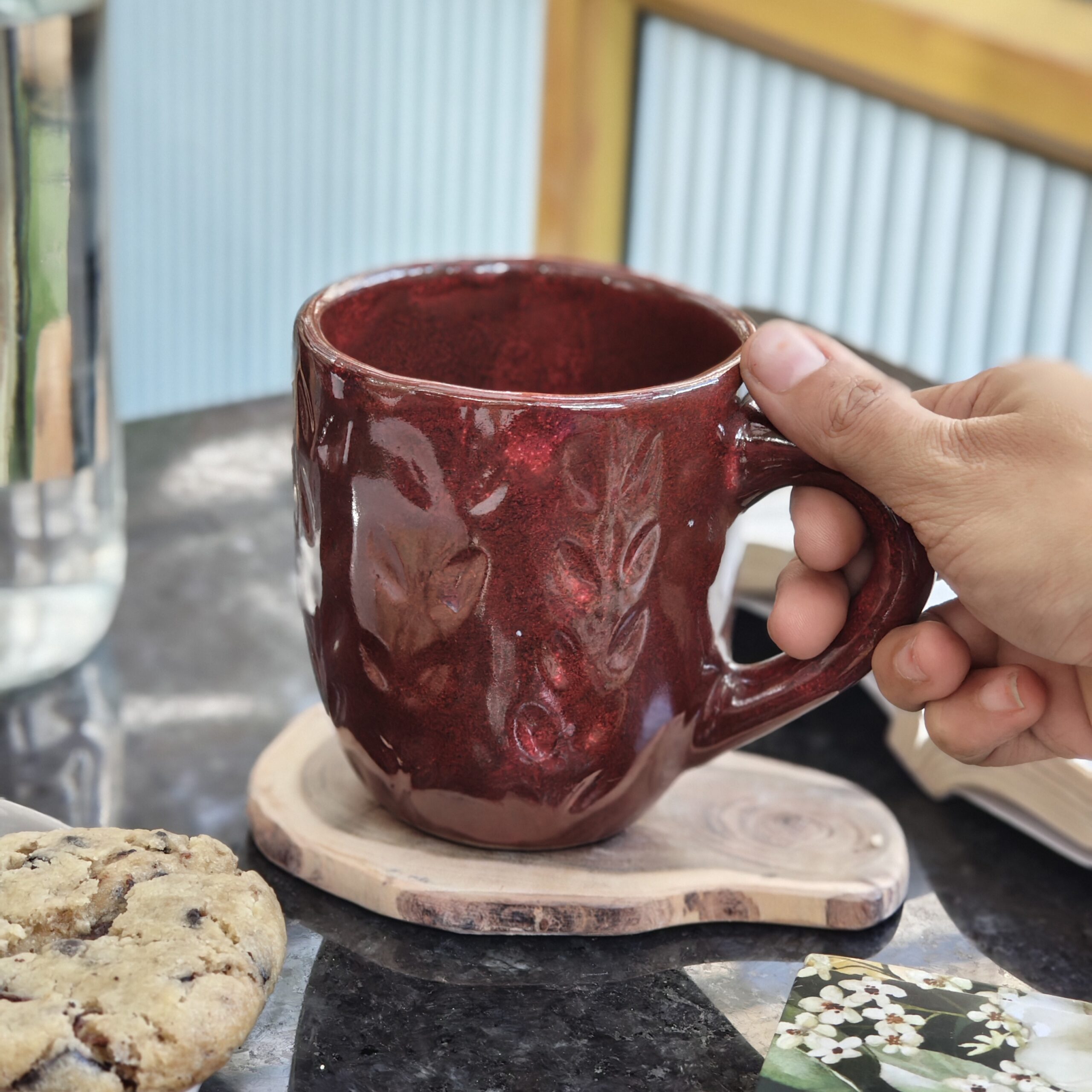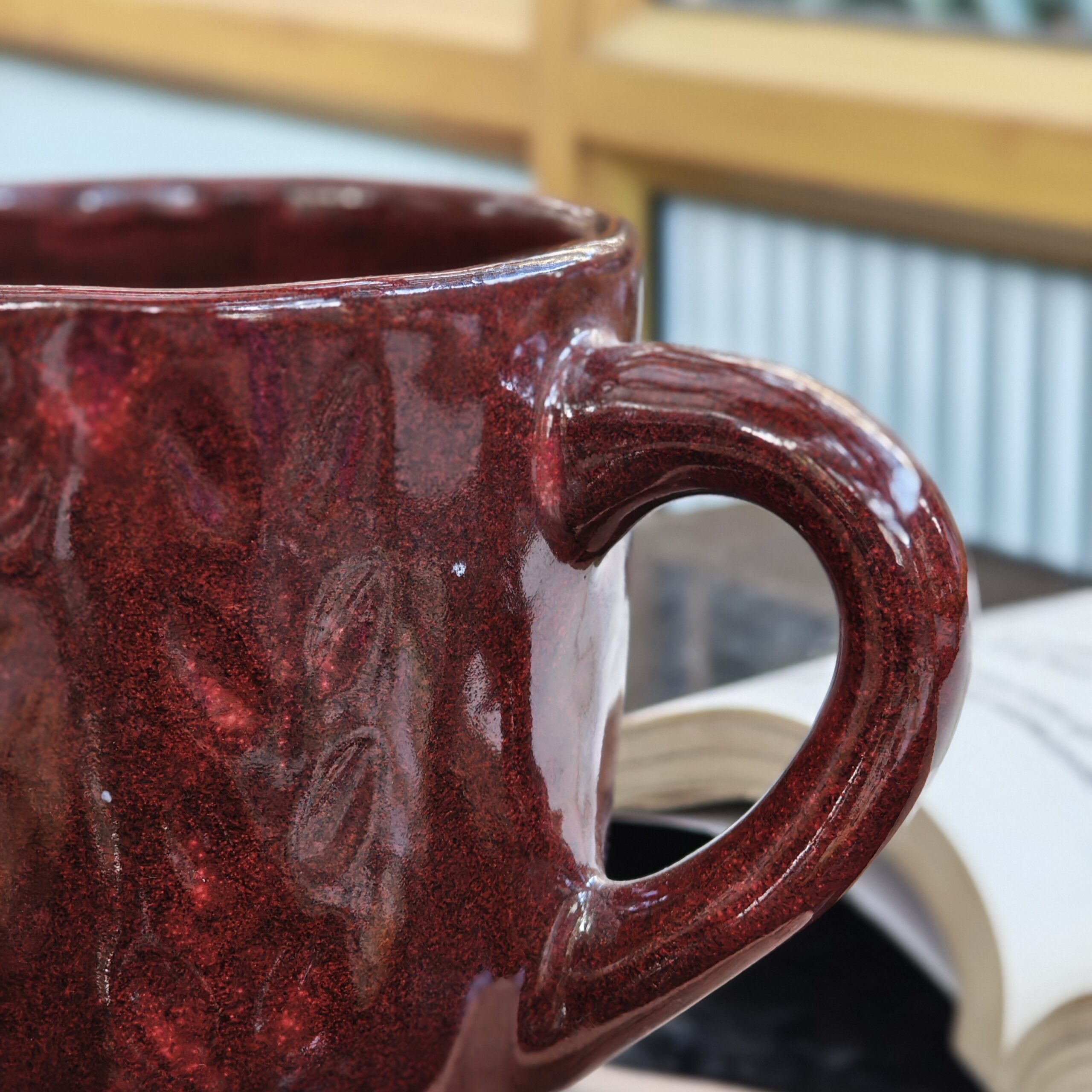 This tall mug features a rich crimson glaze layered over soft embossed leaf patterns, giving it depth, warmth, and a tactile feel. The glossy finish enhances the natural movement of the glaze, making each piece beautifully unique.
