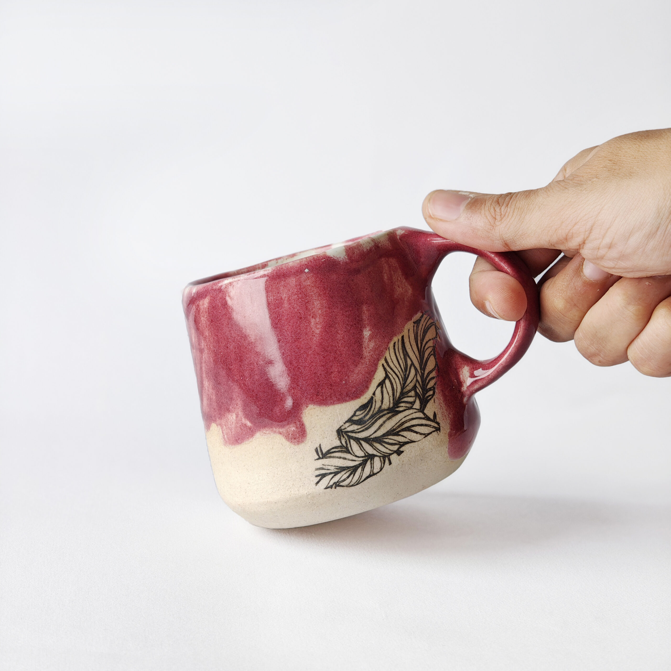 A bold berry-red ceramic mug with delicate feather accents, handcrafted to make every sip feel special.