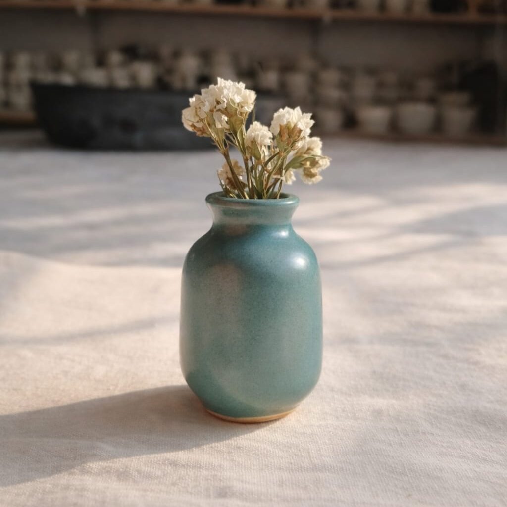 This tiny ceramic pot is shaped with a gentle curve and a soft lip, designed to hold a few delicate stems with quiet elegance. The deep teal glaze settles evenly across the surface, with natural variations that appear during firing, giving each piece its own character.