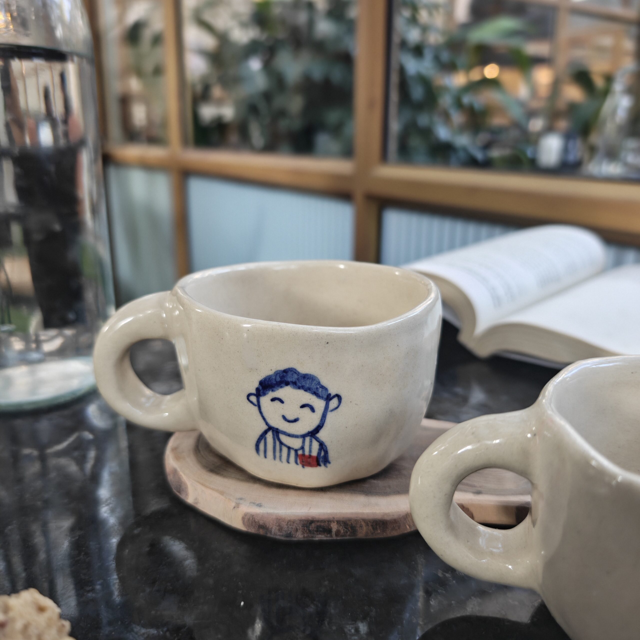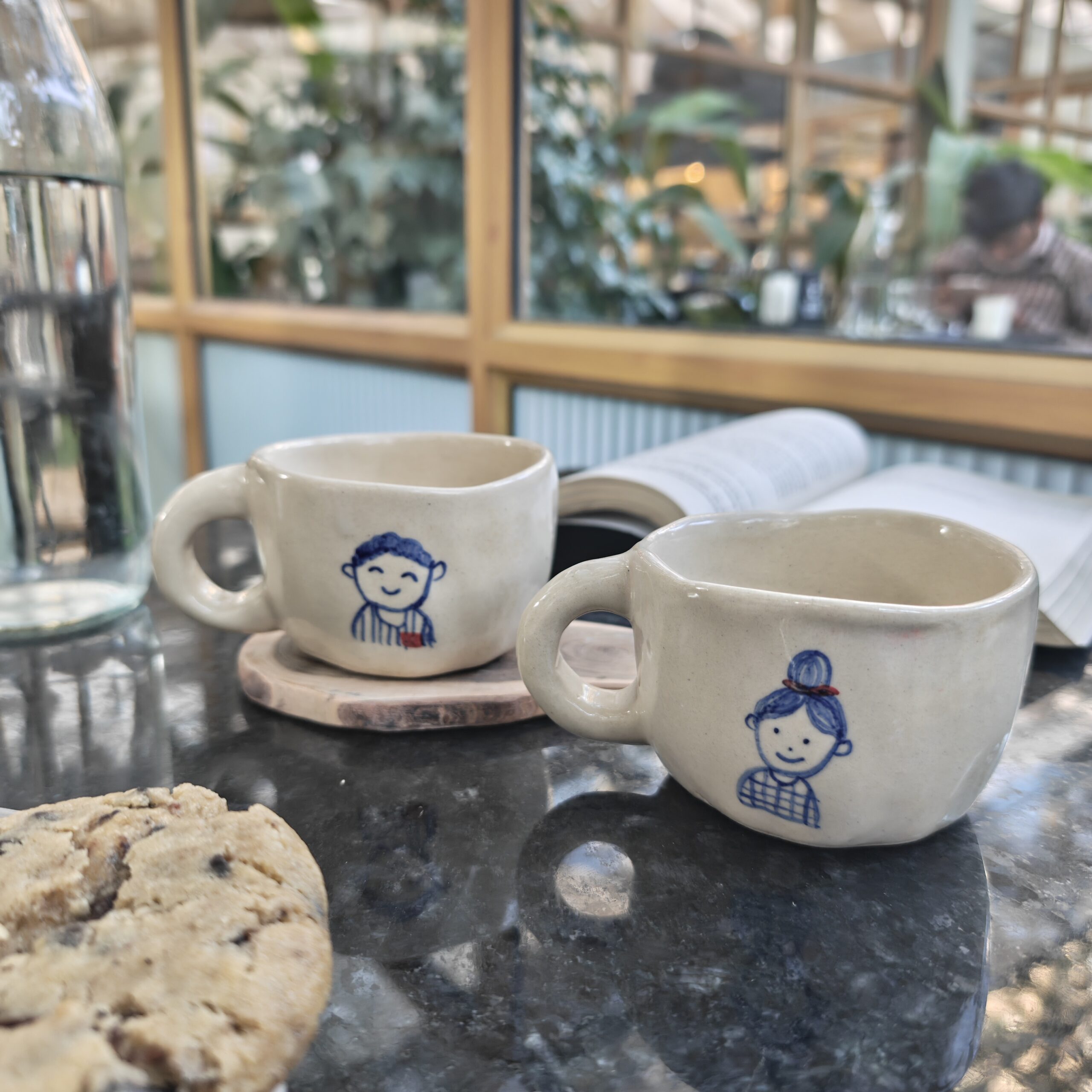 A hand-doodled ceramic cup set featuring a boy and girl illustration on each piece.