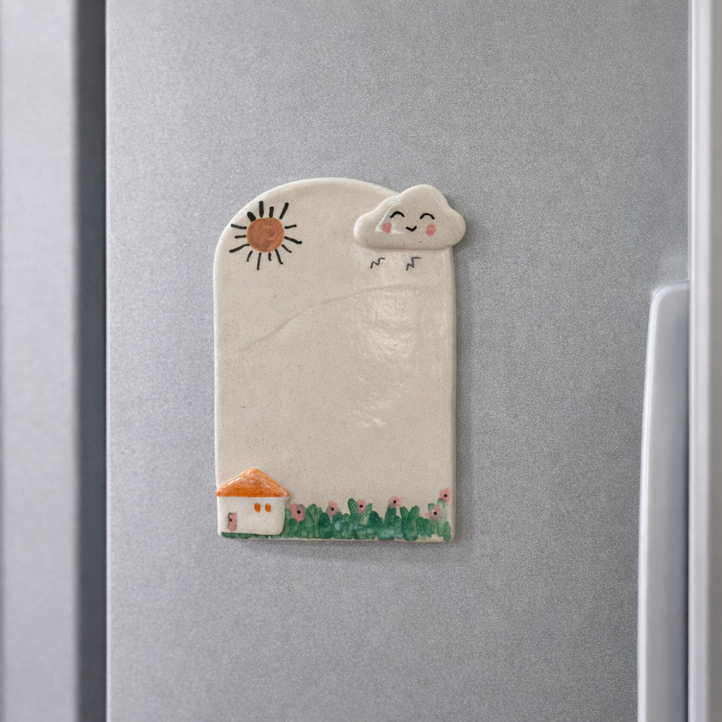 Handcrafted in stoneware and hand-painted with a cheerful home scene, smiling cloud, and sun, this board is designed to live on your fridge, metal cupboard, or any magnetic surface that needs a bit of warmth and whimsy.