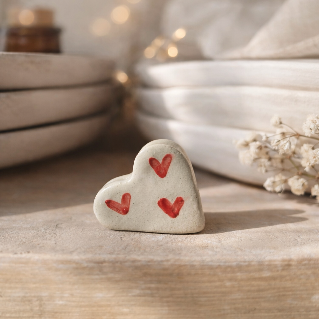 This handmade ceramic photo holder features a soft cloud shape adorned with hand-painted red hearts. Designed to hold photos, polaroids, postcards, or affirmation notes, it adds a warm, whimsical presence to desks, shelves, or bedside tables.