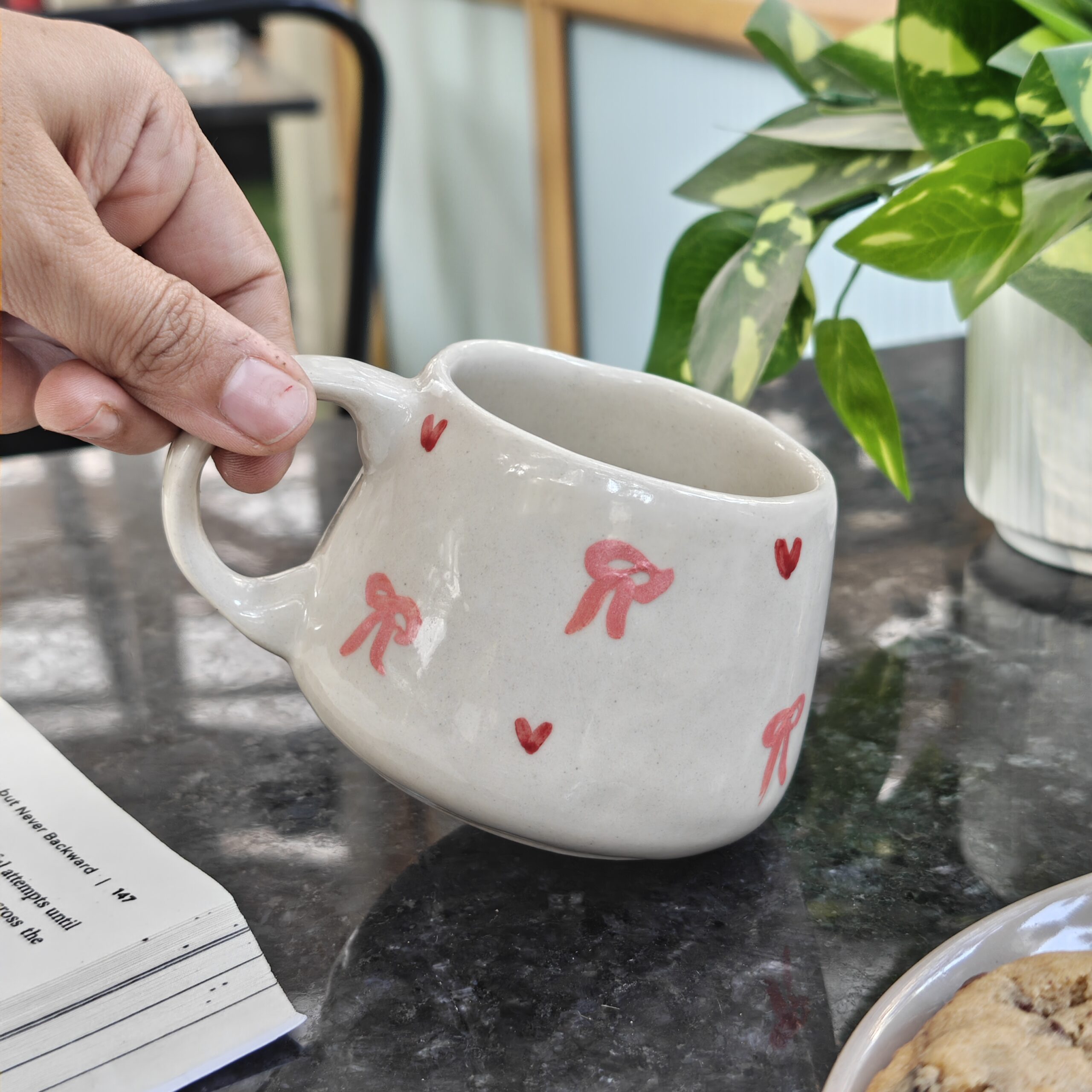 A handmade ceramic mug dotted with tiny hearts and bows, made for slow mornings and cozy sips.