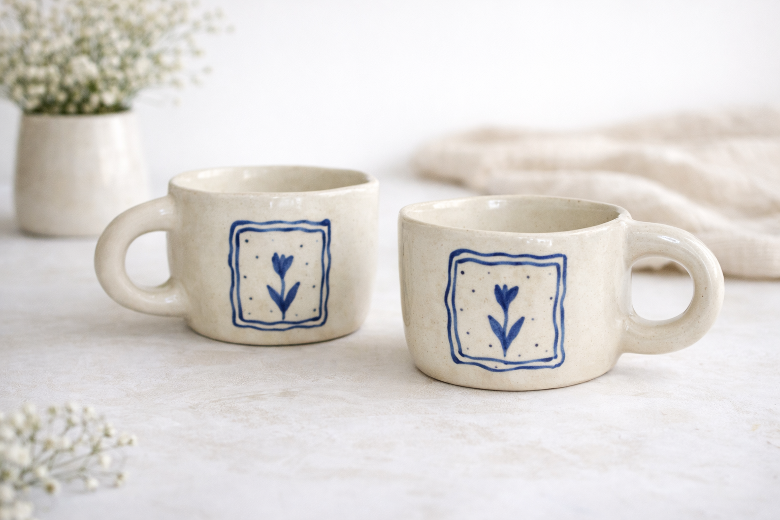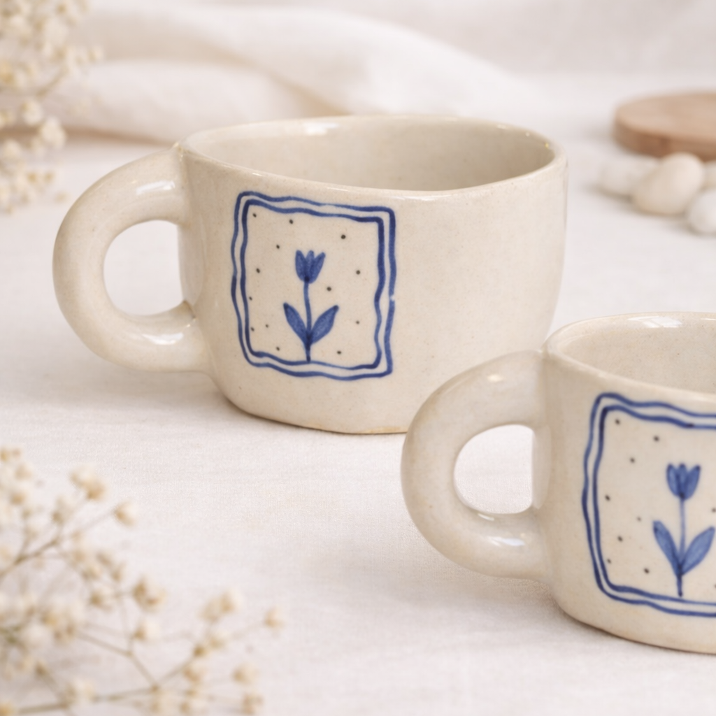 The Little Blue Tulip Cups – Set of 2 are made for slow mornings, shared sips, and gentle rituals. Each cup carries a hand-painted blue tulip motif framed in a delicate square, making every piece subtly unique.