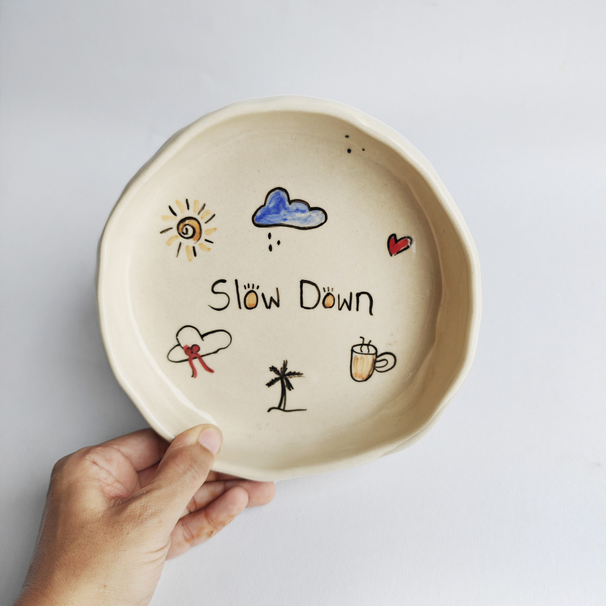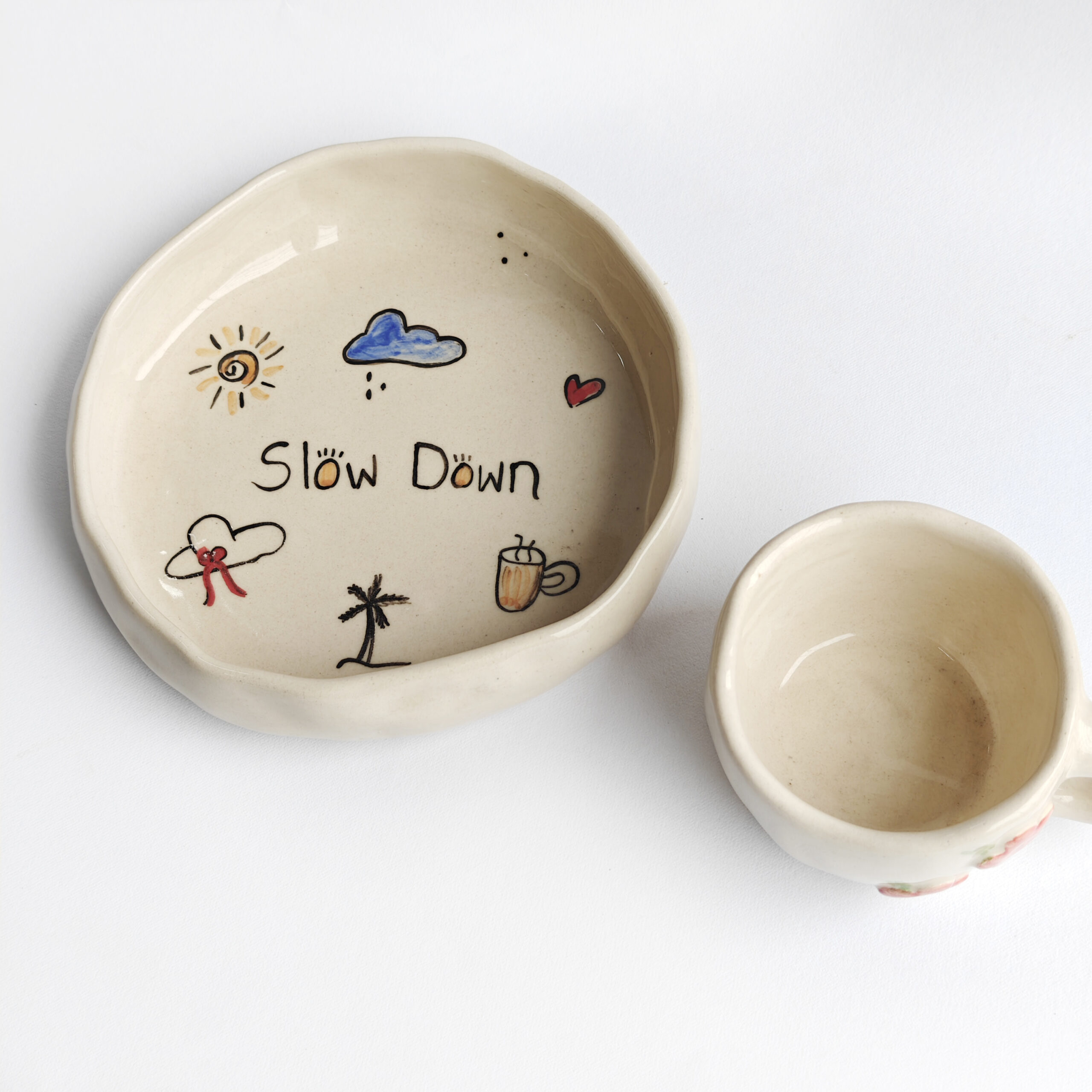 A hand-painted bowl with playful doodles and Slow Down — perfect for one-dish meals or snacks.