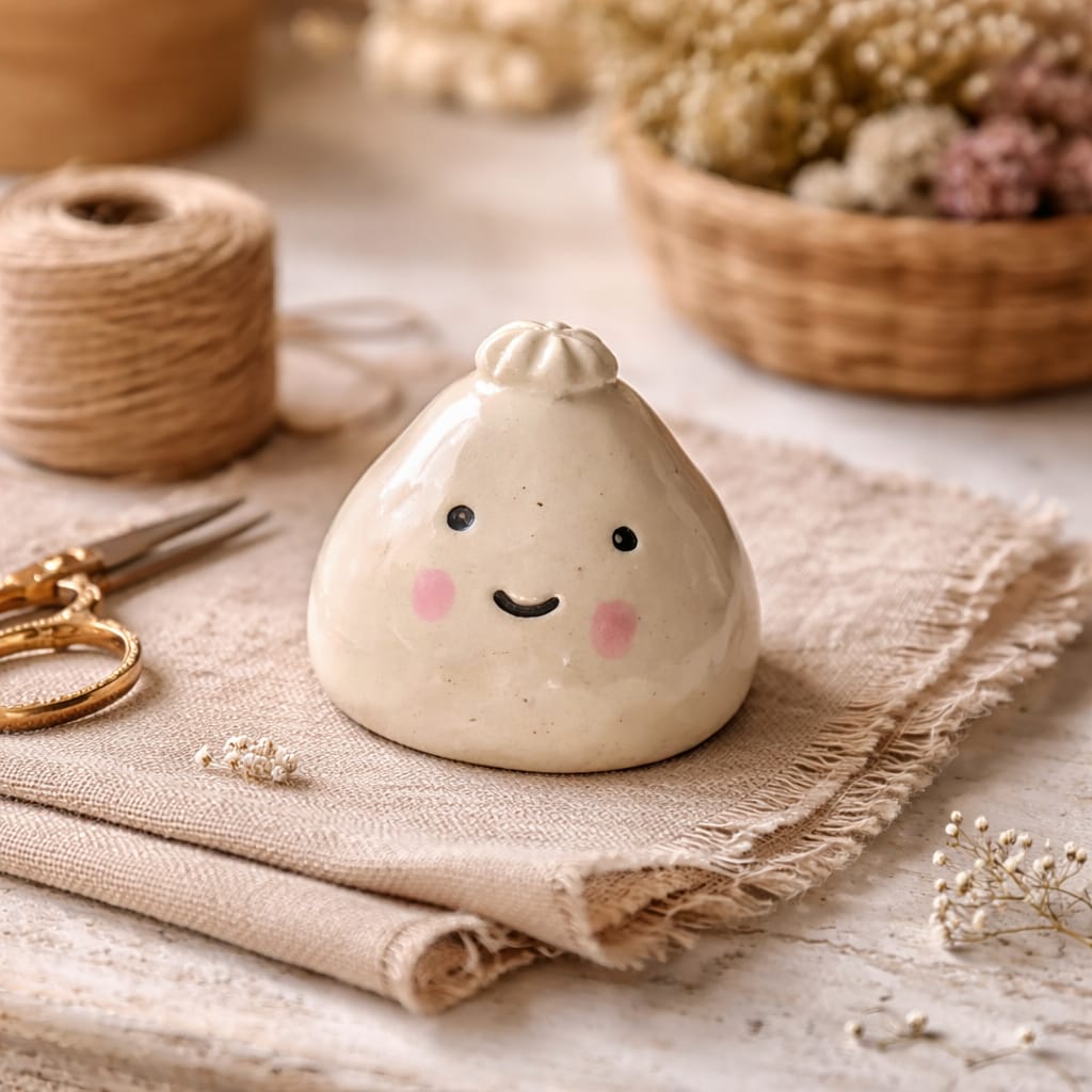 Smiley Dumpling Buddy is a hand-shaped ceramic companion designed to sit quietly on your desk, shelf or bedside and bring a gentle smile to your day. Its rounded dumpling-like form, tiny top knot detail and soft blush cheeks give it a warm, playful personality.