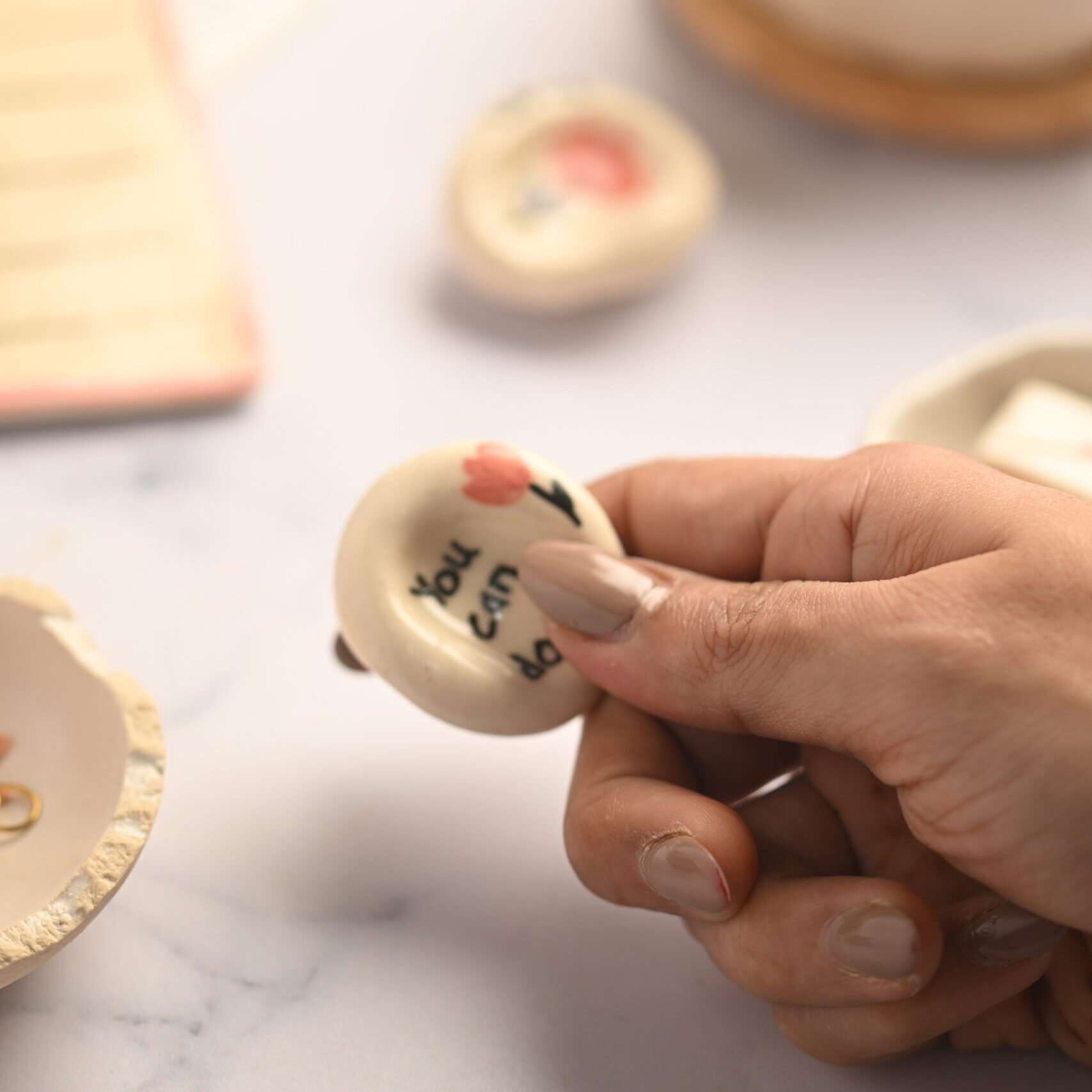 A tiny ceramic worry stone with a gentle message to calm your hands and your mind.