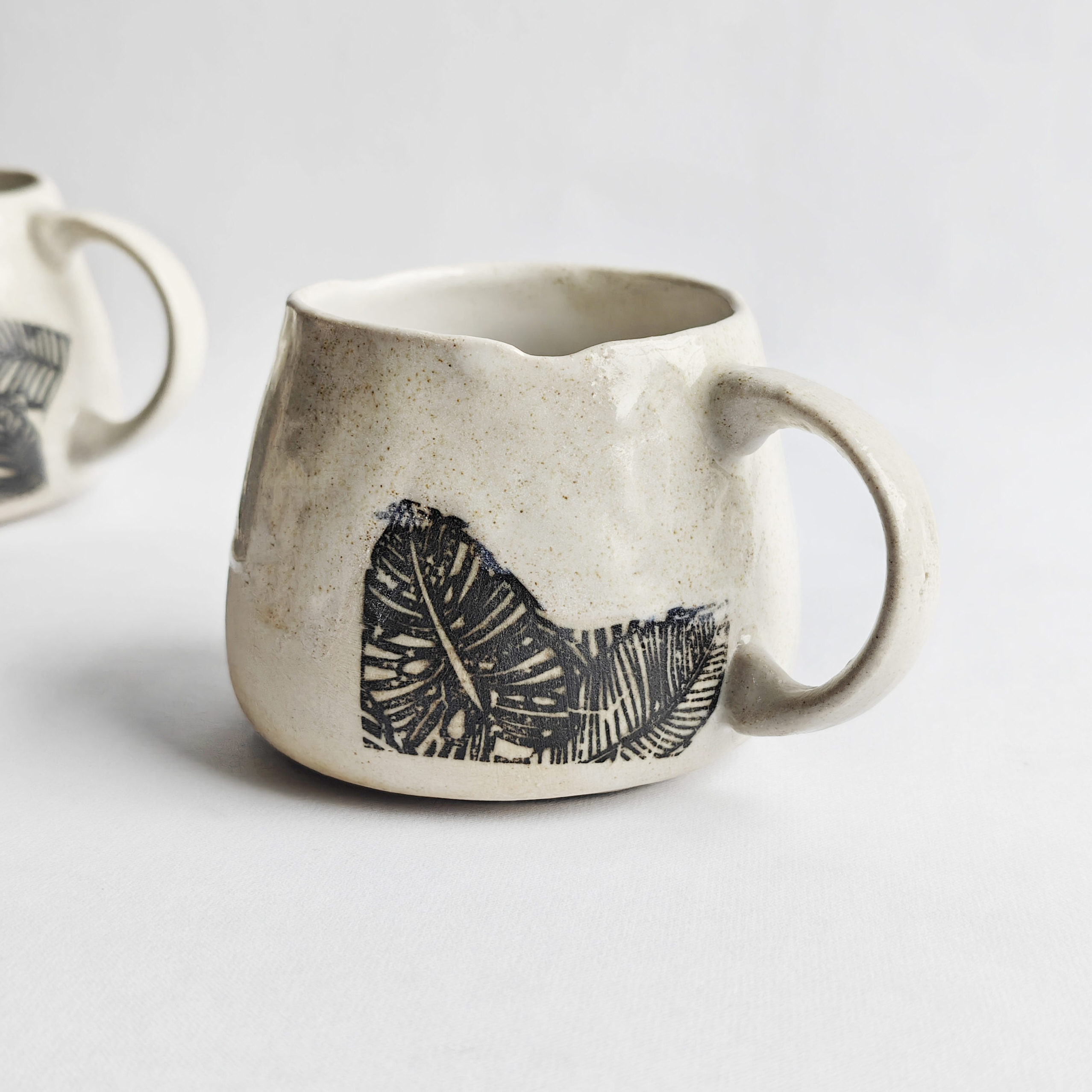 An earthy stoneware mug with bold leaf patterns, perfect for grounding your slow morning brews.