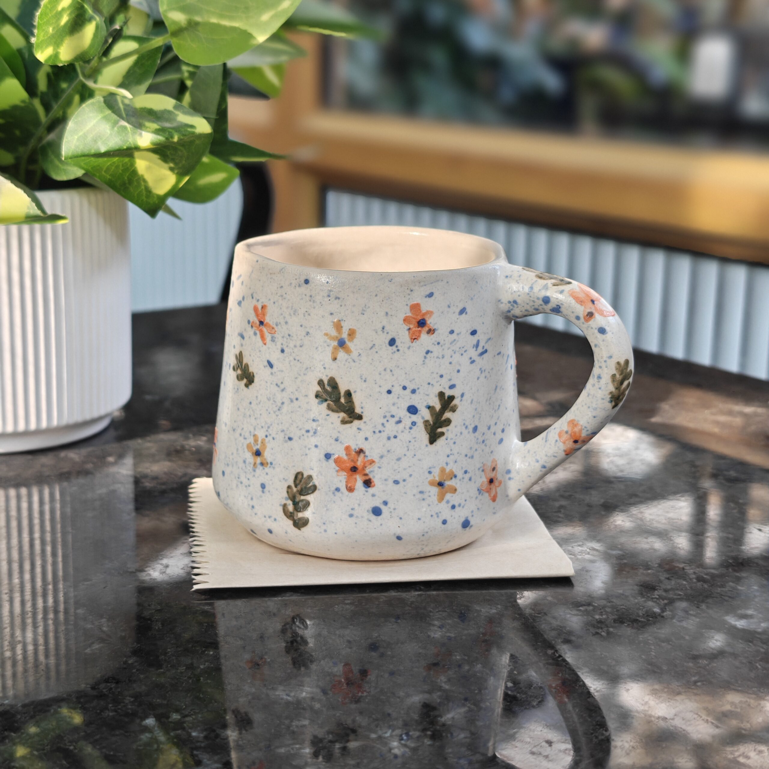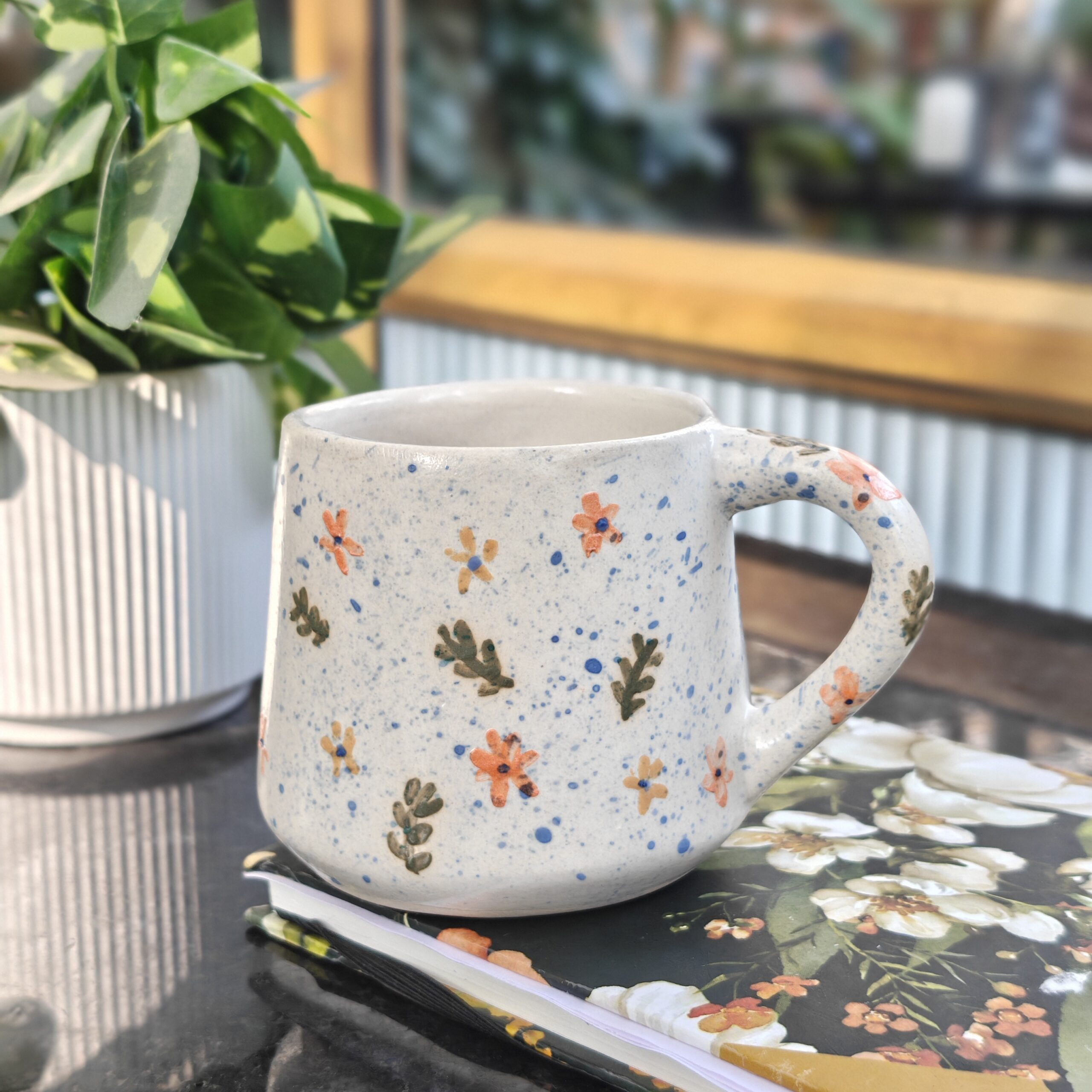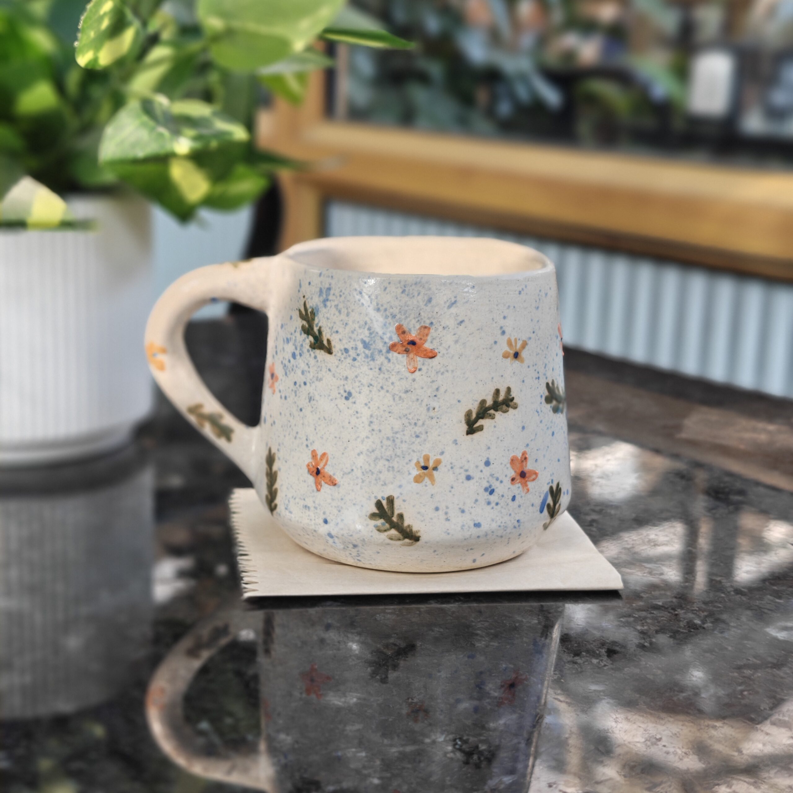 A softly speckled ceramic mug with hand-painted florals and leafy details, made for slow mornings and everyday sips.